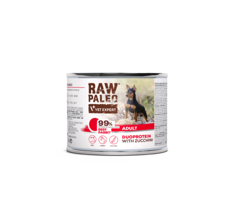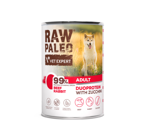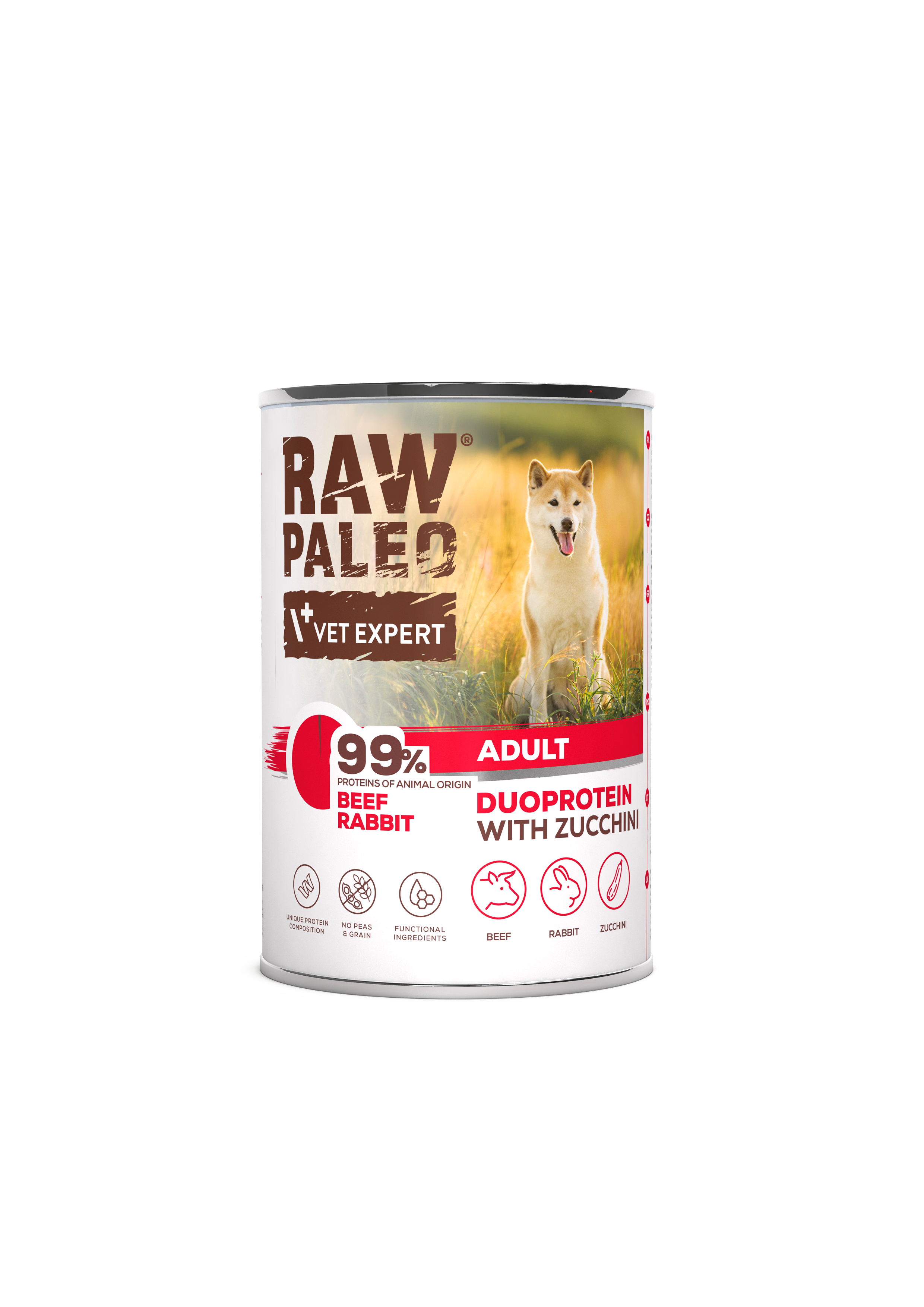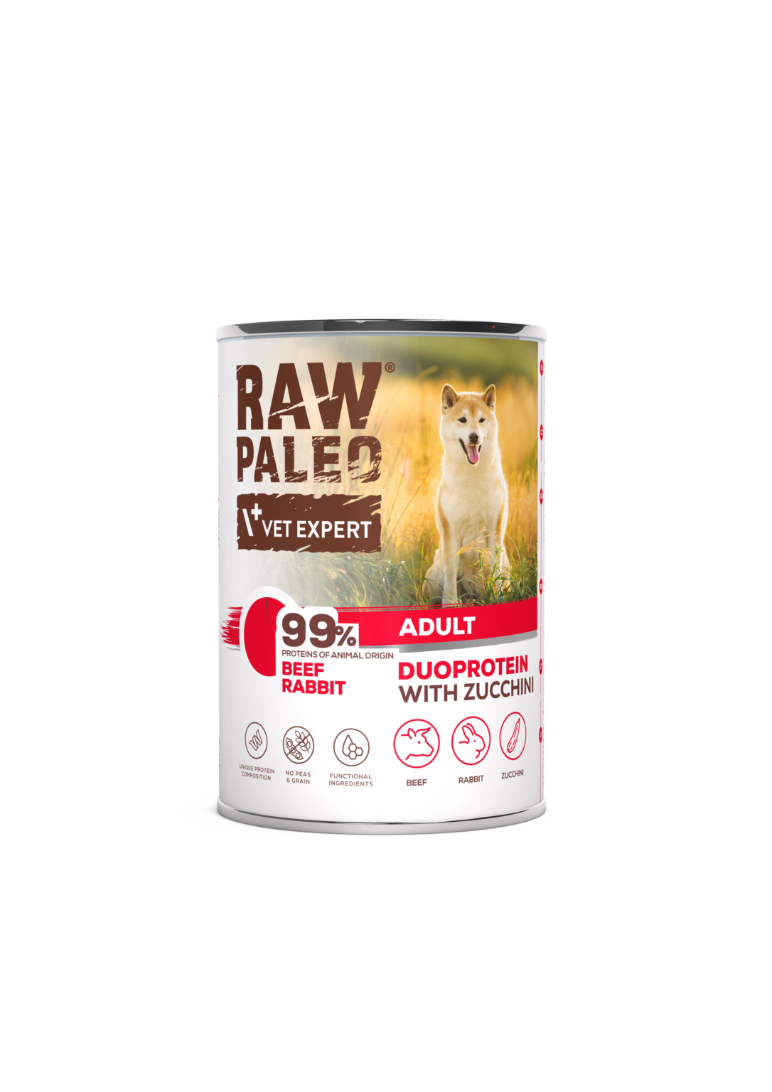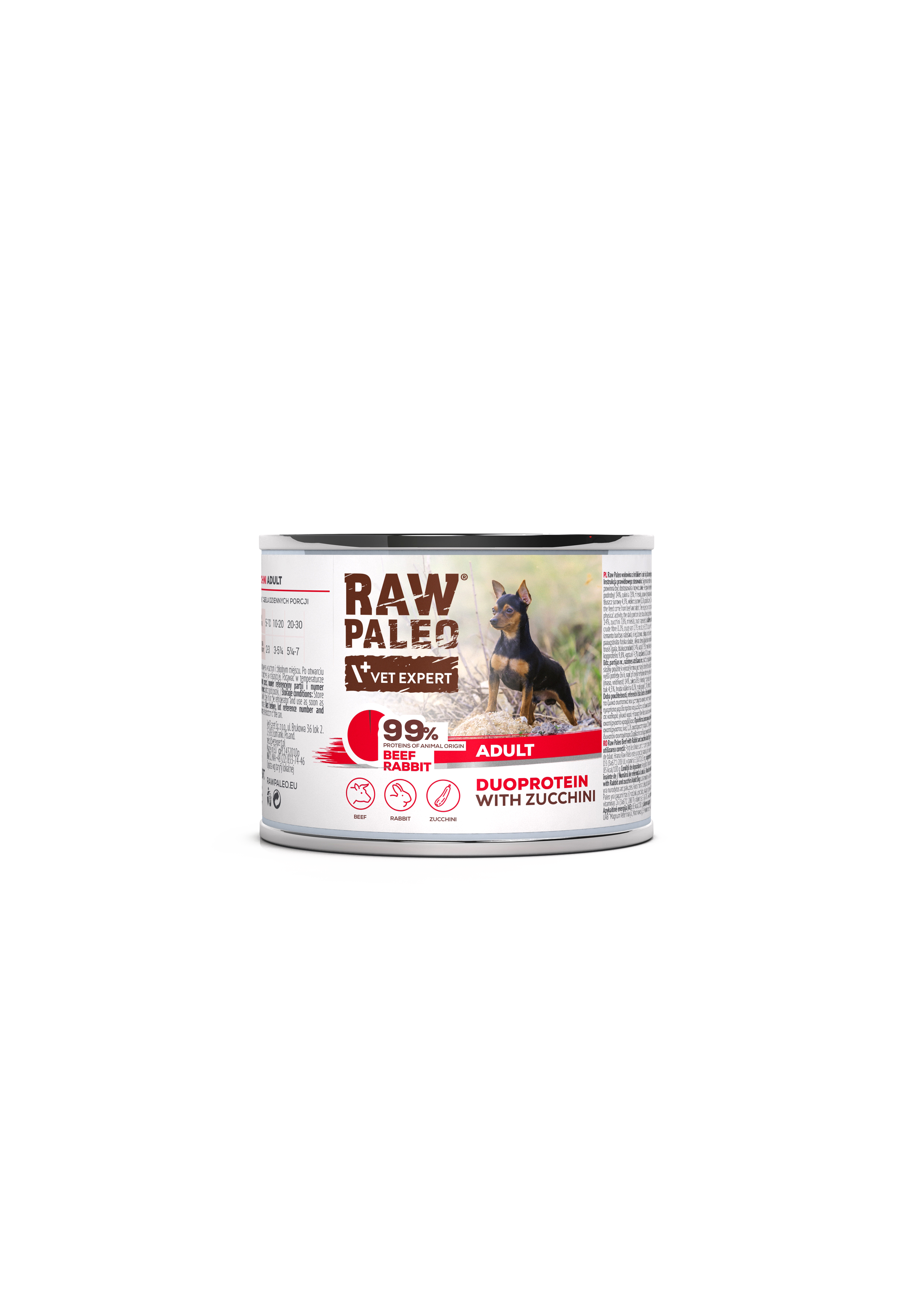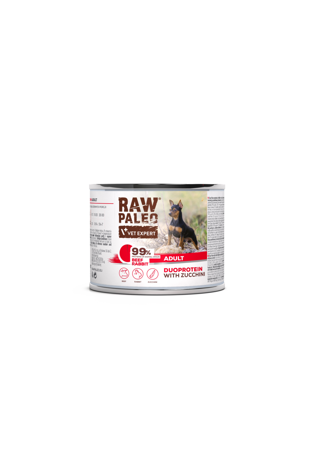 Sudėtis: jautiena (plaučiai, inkstai, mėsa, skrandukai) 46 %, triušiena (mėsa, subproduktai) 14 %, cukinijos 7,8 %, mineralai, nerafinuotas rapsų aliejus.