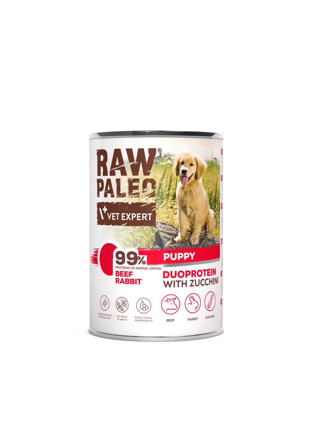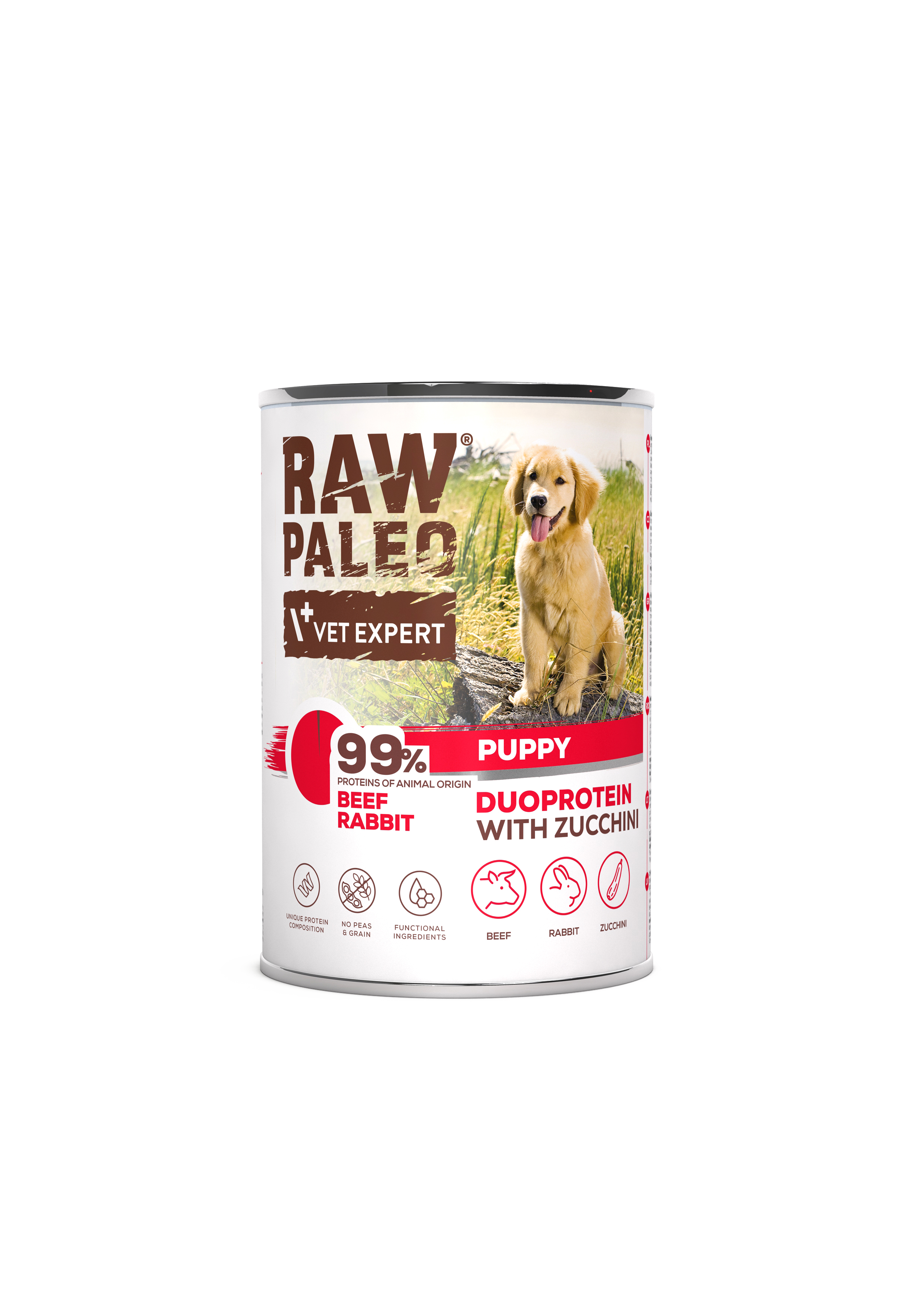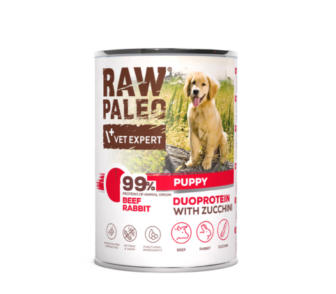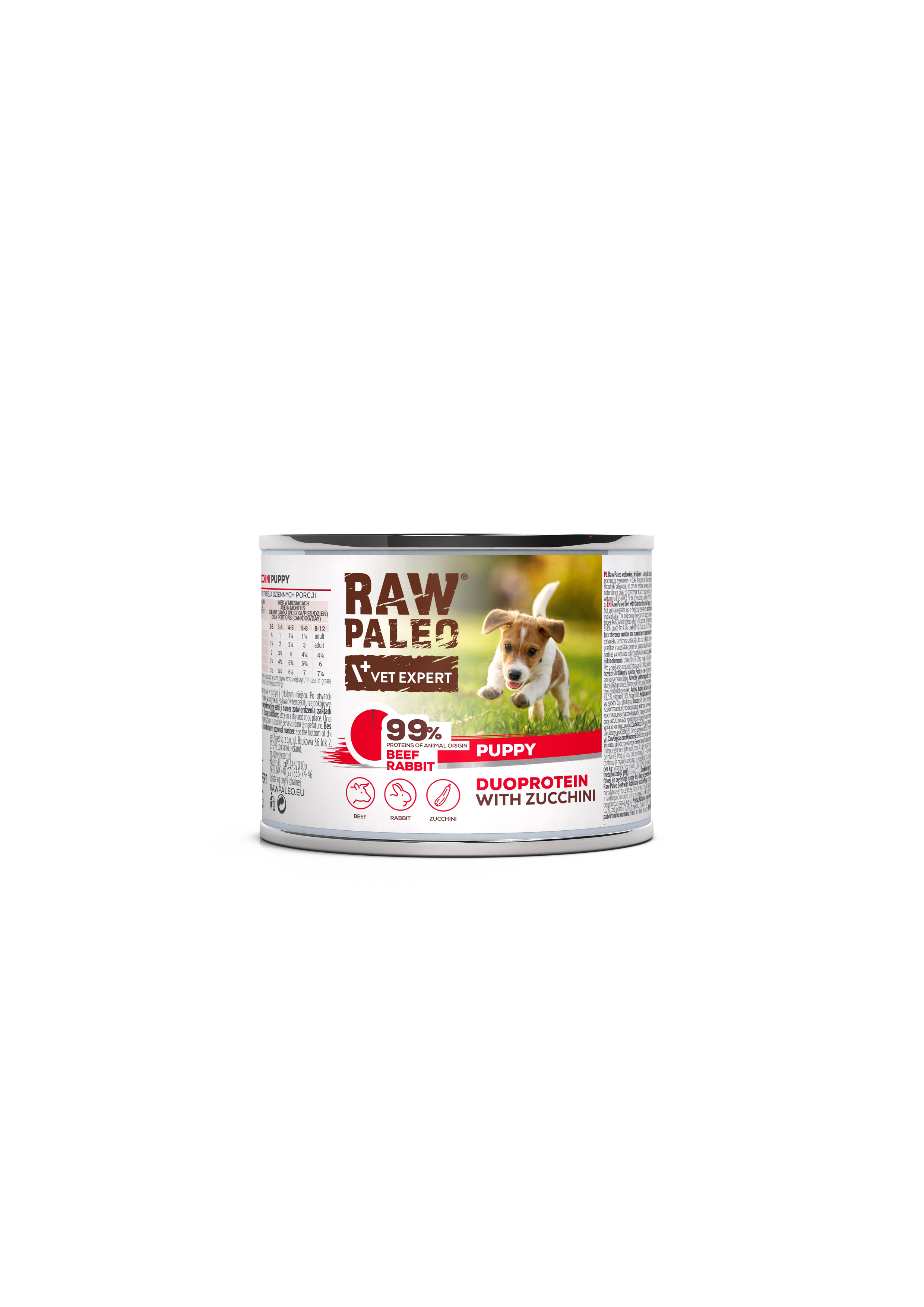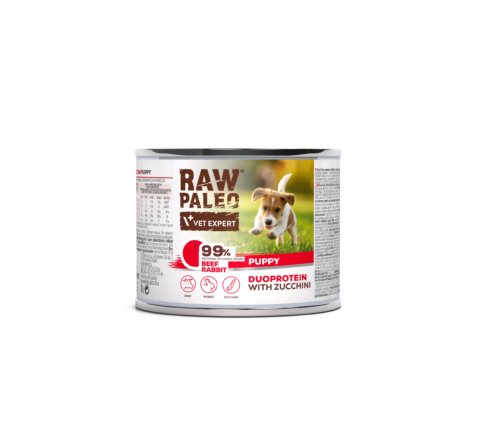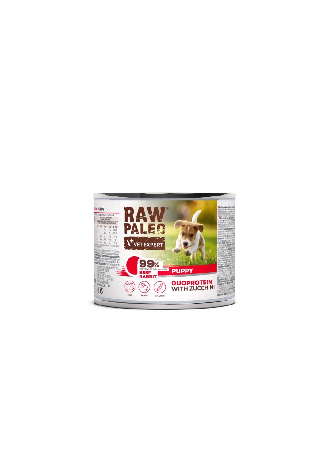 Sudėtis: jautiena (plaučiai, inkstai, mėsa, skrandukai) 46 %, triušiena (mėsa, avinžirniai) 14 %, cukinijos 7,8 %, mineralai, nerafinuotas linų sėmenų aliejus. Priedai.